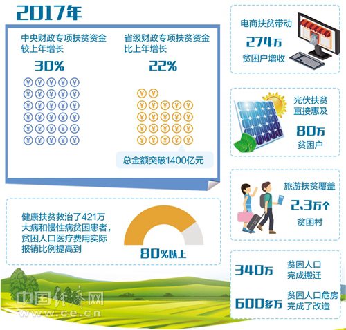 國務院扶貧辦數(shù)據(jù)顯示,2017年,中央財政專項扶貧資金較上年增長30%,省級財政專項扶貧資金比上年增長22%,總金額突破1400億元。電商扶貧帶動274萬貧困戶增收,光伏扶貧直接惠及80萬貧困戶,旅游扶貧覆蓋2.3萬個貧困村。340萬貧困人口完成搬遷,600多萬貧困人口危房完成了改造。健康扶貧救治了421萬大病和慢性病貧困患者,貧困人口醫(yī)療費用實際報銷比例提高到80%以上。