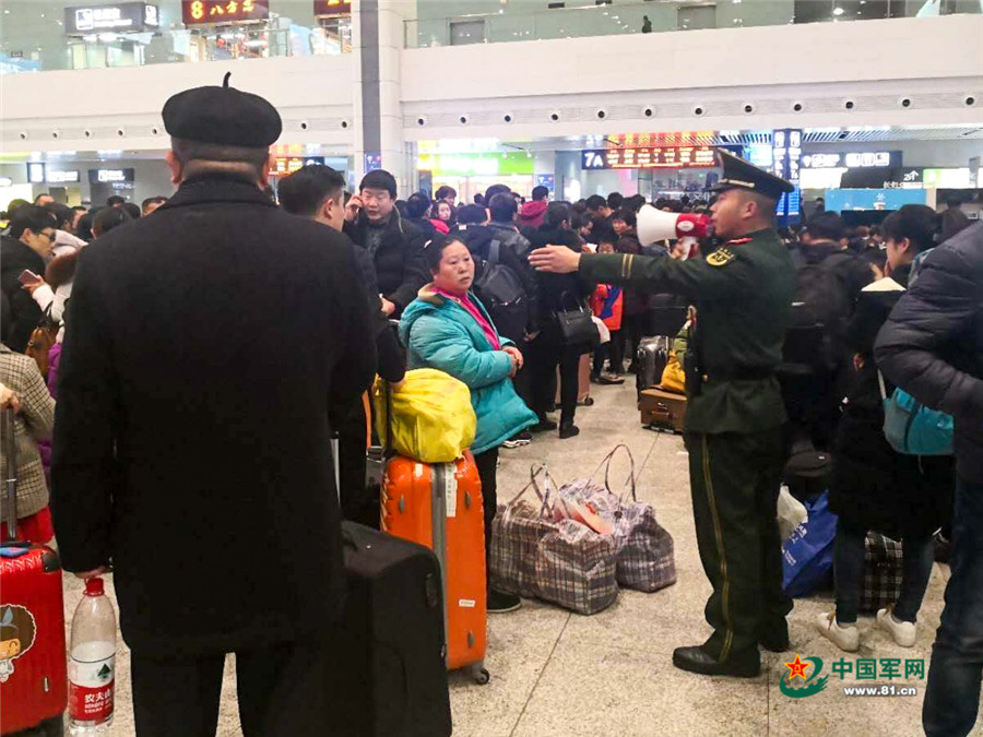 圖為在重慶北站候車大廳,執勤的武警官兵正在維護秩序。
