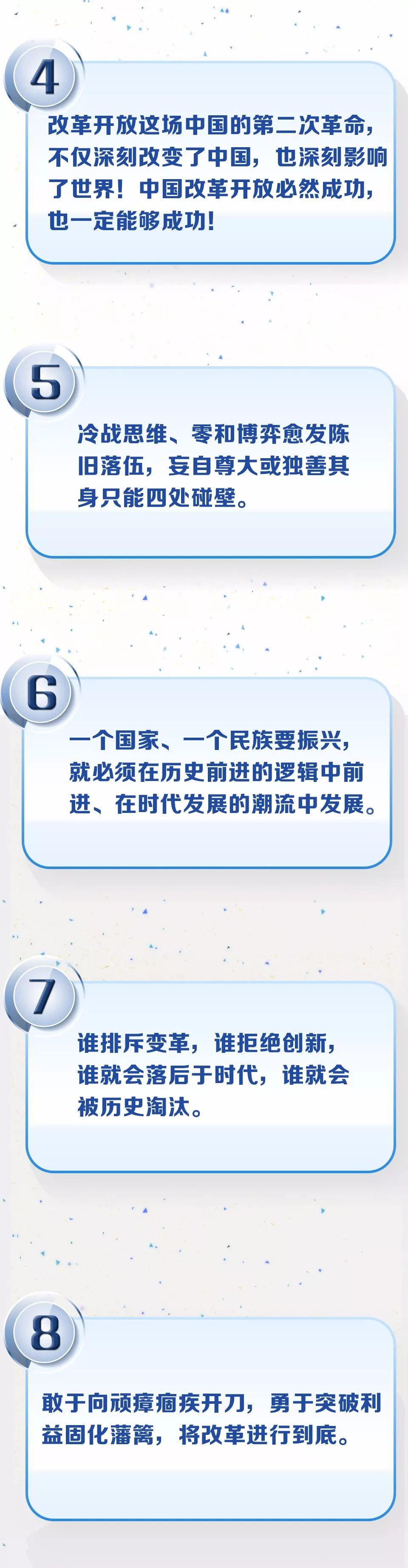 習主席在演講中,對中國改革開放偉大成就、重要經驗和啟示、世界意義和影響,以及在新的歷史當口中國將如何推動對外開放再擴大、深化改革再出發作出最權威的闡述。