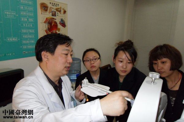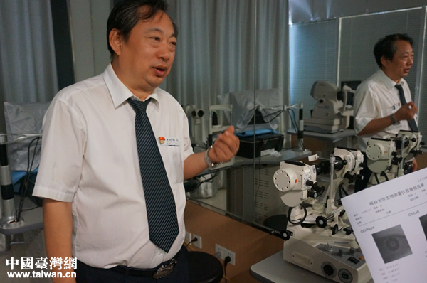 秦英瑞在驗光室里解說設備功能。(中國臺灣網 雍紫薇 攝)