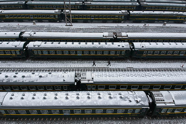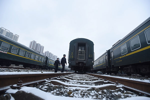 ↑武漢鐵路公安局襄陽公安處民警與鐵路職工對增開旅客列車進行巡查。