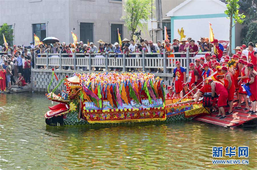 6月3日,在浙江省湖州市長興縣倪家田村,一艘花龍舟準備下水。 端午將至,人們參加多彩民俗活動迎接傳統節日的到來。 新華社發(譚云俸攝)