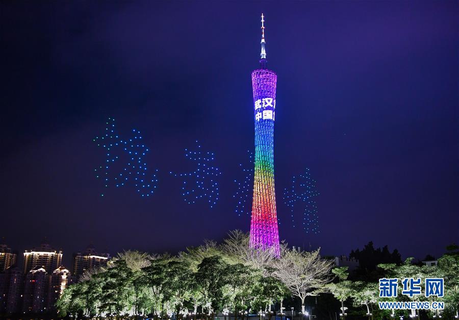2月9日凌晨,廣州珠江上空的無人機編隊組成廣州塔和黃鶴樓圖形。 當日凌晨,無人機編隊在廣州珠江上空拼出“抗擊疫情”“武漢加油”“元宵節快樂”字樣以及廣州塔和黃鶴樓圖形等,為武漢加油。 新華社記者 劉大偉 攝
