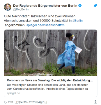 德國參議院發言人Melanie Reinsch5日上午表示,這批貨物由德國聯邦國防軍送至柏林。柏林市長邁克爾·穆勒(Michael Müller)也在其個人社交賬號上表示這是一個“好消息”。