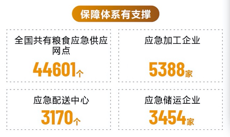 首先,保障體系有支撐,原糧儲備、成品糧儲備充足,一批應(yīng)急加工企業(yè)、應(yīng)急供應(yīng)網(wǎng)點、應(yīng)急配送中心和應(yīng)急儲運企業(yè)已建成;其次,市場波動有監(jiān)測,我國建立起兩級監(jiān)測體系,國家級糧食市場信息直報點1072個,地方糧食市場信息監(jiān)測點9206個;第三,應(yīng)對變化有預案:我國建立了從國家、省、市、縣四級的糧食應(yīng)急預案體系;第四,保供穩(wěn)市有責任:我國已建立并督促各地嚴格落實糧食安全省長責任制。