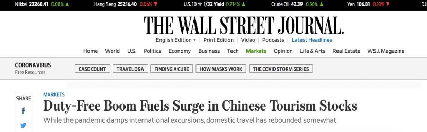 《華爾街日報》近日發表題為《免稅熱潮助推中國旅游業股票大漲》的文章。文章指出,雖然新冠肺炎疫情影響國際旅游,但中國國內旅游熱度有所回升,中國旅游業迅速回暖,并促進中國經濟第二季度恢復增長。