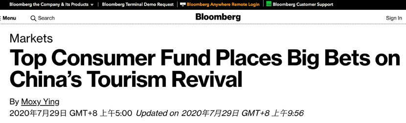 彭博社7月29日一篇報道同樣關注到這一點。彭博社報道稱,就在新冠疫情迫使世界各國封閉邊界之際,國際頂尖基金公司看好中國旅游業復蘇。韓國未來資產亞洲卓越消費股票基金(Mirae Asset Asia Great Consumer Equity Fund)首席投資組合經理安珠熙(Joohee An)對中國國內旅游市場寄予厚望,并買入了與中國旅游業相關的股票。