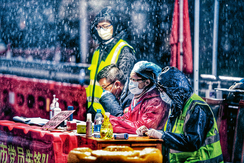 疫情發生后,廣東省鶴山市廣大黨員、機關干部、民警,主動放棄休假,24小時輪值堅守崗位,全力打好疫情防控戰,切實維護人民生命安全和身體健康。圖為2月4日凌晨,鶴山市大雨傾盆,天氣寒冷,黨員干部、醫務人員在公安民警、交通執法等單位人員配合下,對進入鶴山市的所有車輛人員進行體溫檢測、詢問情況。人民圖片 黃繼明/攝