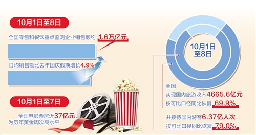 經濟日報-中國經濟網北京10月8日訊(記者馮其予 張雪 陳果靜 常理)來自商務部的數據顯示,今年國慶中秋假日期間全國各地在做好疫情防控前提下,積極組織開展豐富多彩的促消費活動,消費需求加快釋放,市場人氣持續攀升,國內大循環活力強勁。10月1日至8日,全國零售和餐飲重點監測企業銷售額約1.6萬億元,日均銷售額比去年國慶假期增長4.9%。同時,來自中國銀聯的數據顯示,10月1日至7日,銀聯網絡的交易金額達到2.16萬億元,較去年同期增長了6.3%。