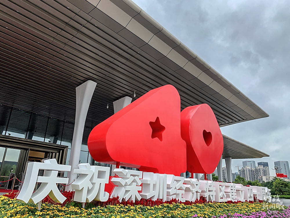 △“40”是慶祝大會當天最醒目、設計最獨特的數字。4里面是一顆五角星,取自五星紅旗,0里面是一顆愛心,這個標識的名字叫做“星心相映”,寓意著深圳是一顆明日之星,也是一座愛心之城。(總臺央視記者程鋮拍攝)