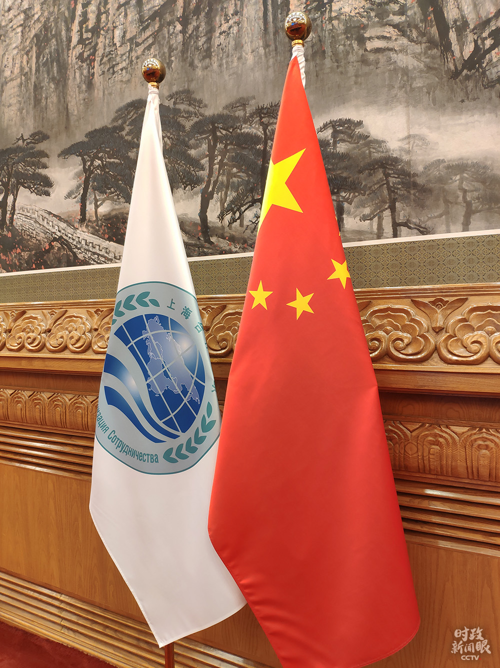 △會場內擺放的中國國旗和上海合作組織旗幟(總臺央視記者耿小龍拍攝)