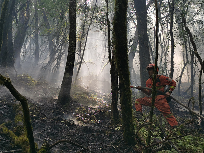 2019年3月,在涼山木里火場,王鵬和戰友連續奮戰10余天,成功將大火撲滅。王鵬身背滅火機撲打明火。
