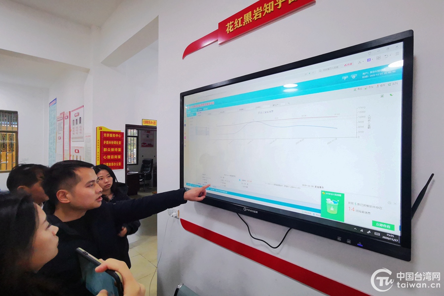 黑巖村工作人員向采訪團展示防貧監(jiān)測預警系統(tǒng)。(中國臺灣網(wǎng) 尹賽楠 攝)