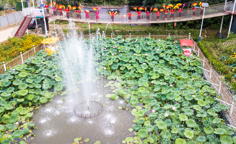 △2020年7月14日,河北省饒陽縣王同岳鎮(zhèn)王同岳村村民在廢棄坑塘改造的小花園內(nèi)排練節(jié)目。
