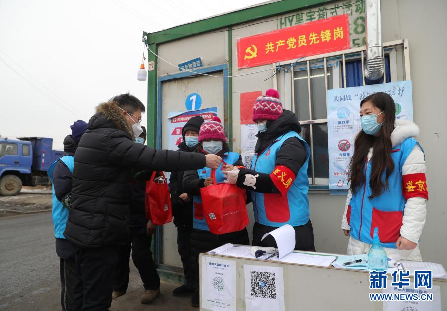 1月20日,在沈陽市和平區渾河站西街道下河灣村,街道工作人員給“盛京義勇”疫情防控志愿者送去臘八粥。