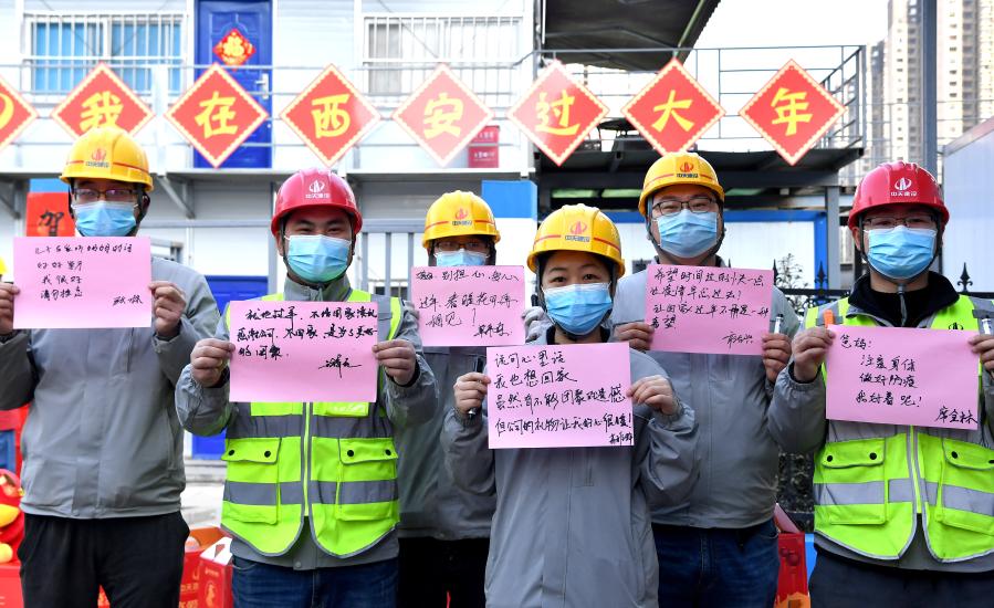 2月1日,在西安中天西北集團一住房項目建設(shè)工地,建設(shè)者寫下自己想對家人說的話。新華社記者 劉瀟 攝
