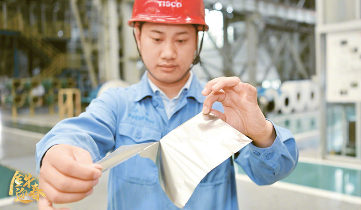 太鋼不銹鋼精密帶鋼有限公司員工在展示用手撕開0.02毫米厚的寬幅軟態不銹鋼精密箔材。