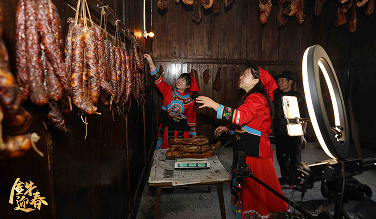 2021年1月15日,電商服務志愿者通過直播的方式幫助偏遠山村群眾推介銷售臘肉、香腸等特色“年味”農產品。