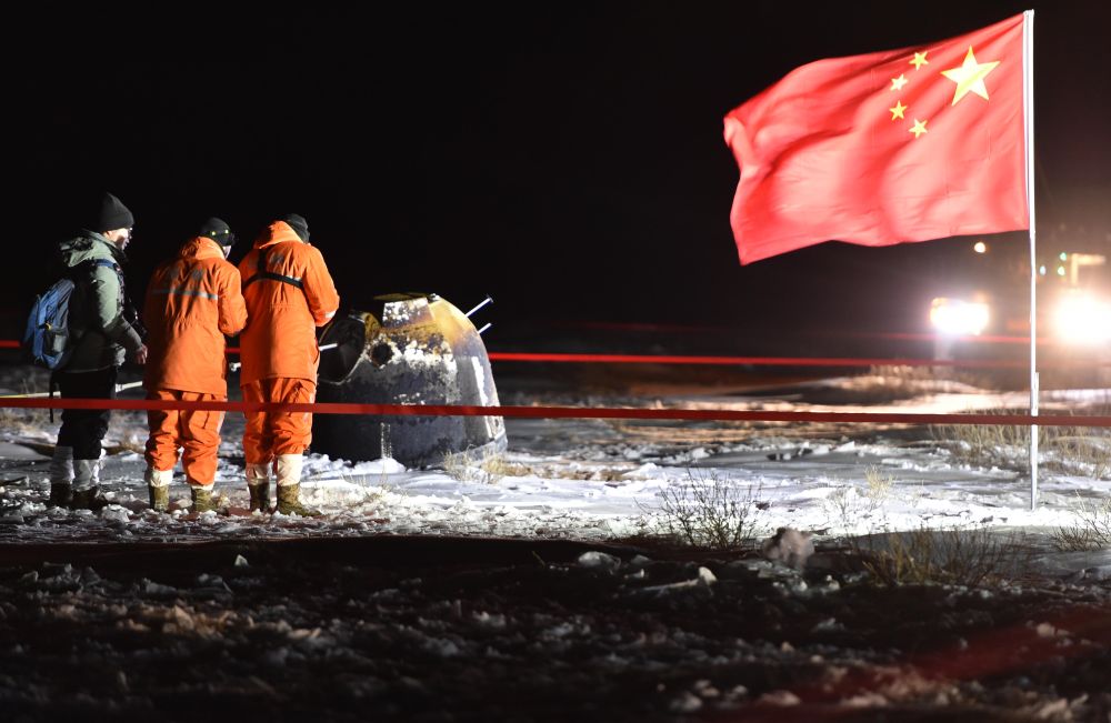 ▲ 2020年12月17日凌晨,嫦娥五號返回器攜帶月球樣品,采用半彈道跳躍方式再入返回,在內(nèi)蒙古四子王旗預定區(qū)域安全著陸。