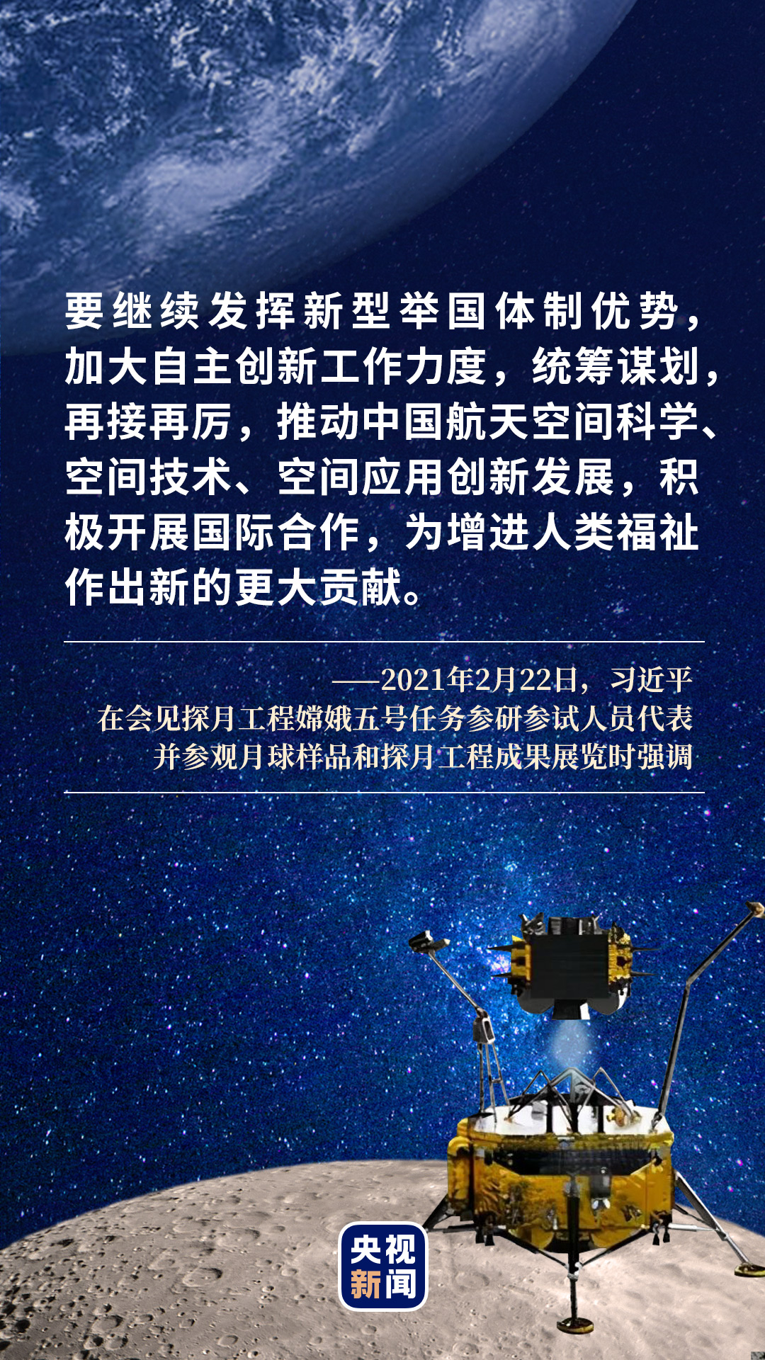 “要弘揚探月精神,發(fā)揮新型舉國體制優(yōu)勢,勇攀科技高峰,服務國家發(fā)展大局,一步一個腳印開啟星際探測新征程,不斷推進中國航天事業(yè)創(chuàng)新發(fā)展,為人類和平利用太空作出新的更大貢獻!边@是習近平對探月工程取得成就的充分肯定,也是對我國航天人提出新的更高要求。