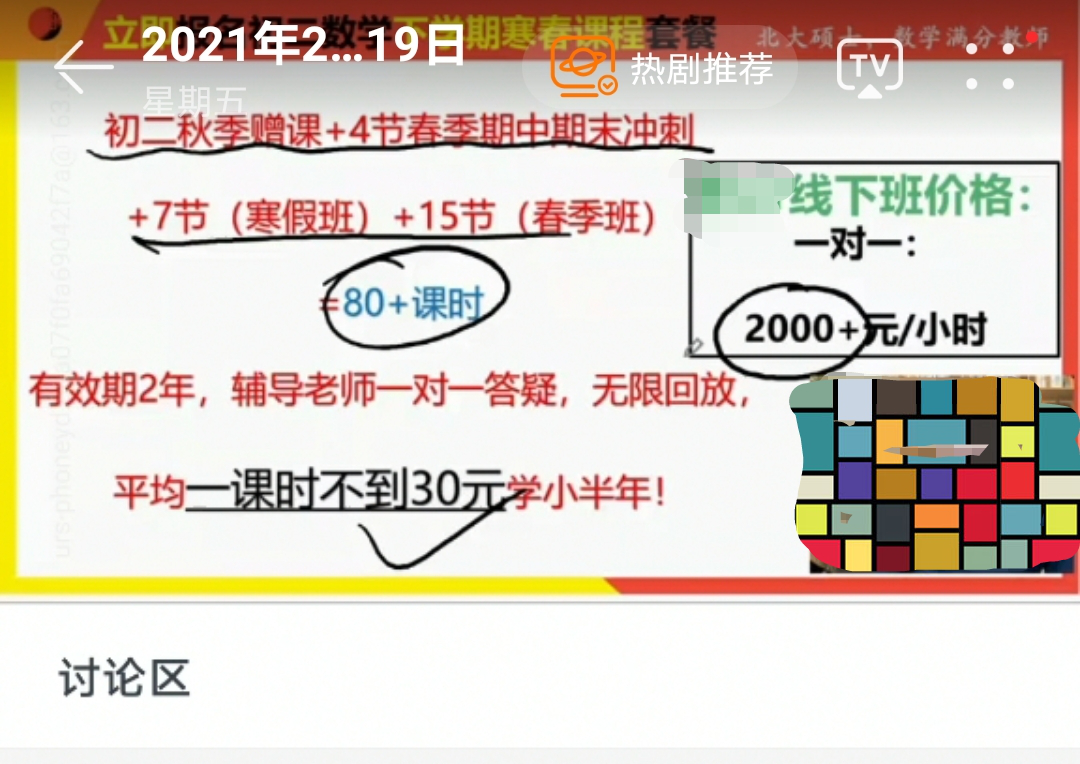 未來(lái)網(wǎng)北京2月25日電(記者 李盈盈)“現(xiàn)在報(bào)名我的在線課,(一學(xué)期)只需要2000多元,特別劃算!在線下,報(bào)我的一對(duì)一課,一節(jié)課收費(fèi)2000多元,而且,(學(xué)生排隊(duì))已經(jīng)排到了半年之后。”春節(jié)過(guò)后,家長(zhǎng)權(quán)翼為孩子領(lǐng)取了在線教育機(jī)構(gòu)網(wǎng)易有道精品課的免費(fèi)課。課程快結(jié)束時(shí),該機(jī)構(gòu)的一位數(shù)學(xué)“名師”變身銷售,大力賣課。