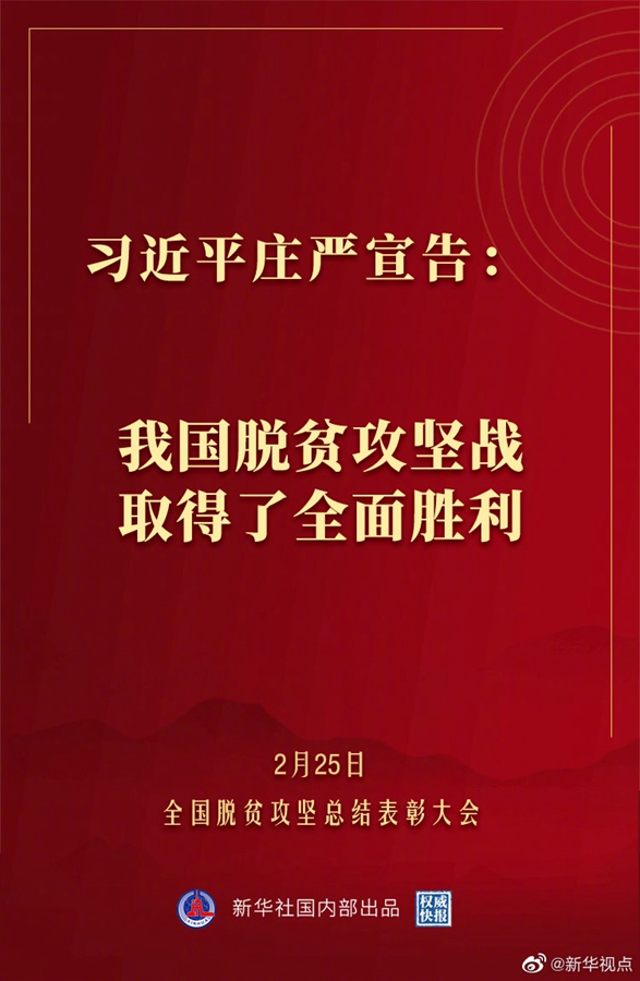 習近平在全國脫貧攻堅總結表彰大會上發表重要講話,莊嚴宣告,經過全黨全國各族人民共同努力,在迎來中國共產黨成立一百周年的重要時刻,我國脫貧攻堅戰取得了全面勝利,現行標準下9899萬農村貧困人口全部脫貧,832個貧困縣全部摘帽,12.8萬個貧困村全部出列,區域性整體貧困得到解決,完成了消除絕對貧困的艱巨任務,創造了又一個彪炳史冊的人間奇跡!這是中國人民的偉大光榮,是中國共產黨的偉大光榮,是中華民族的偉大光榮!