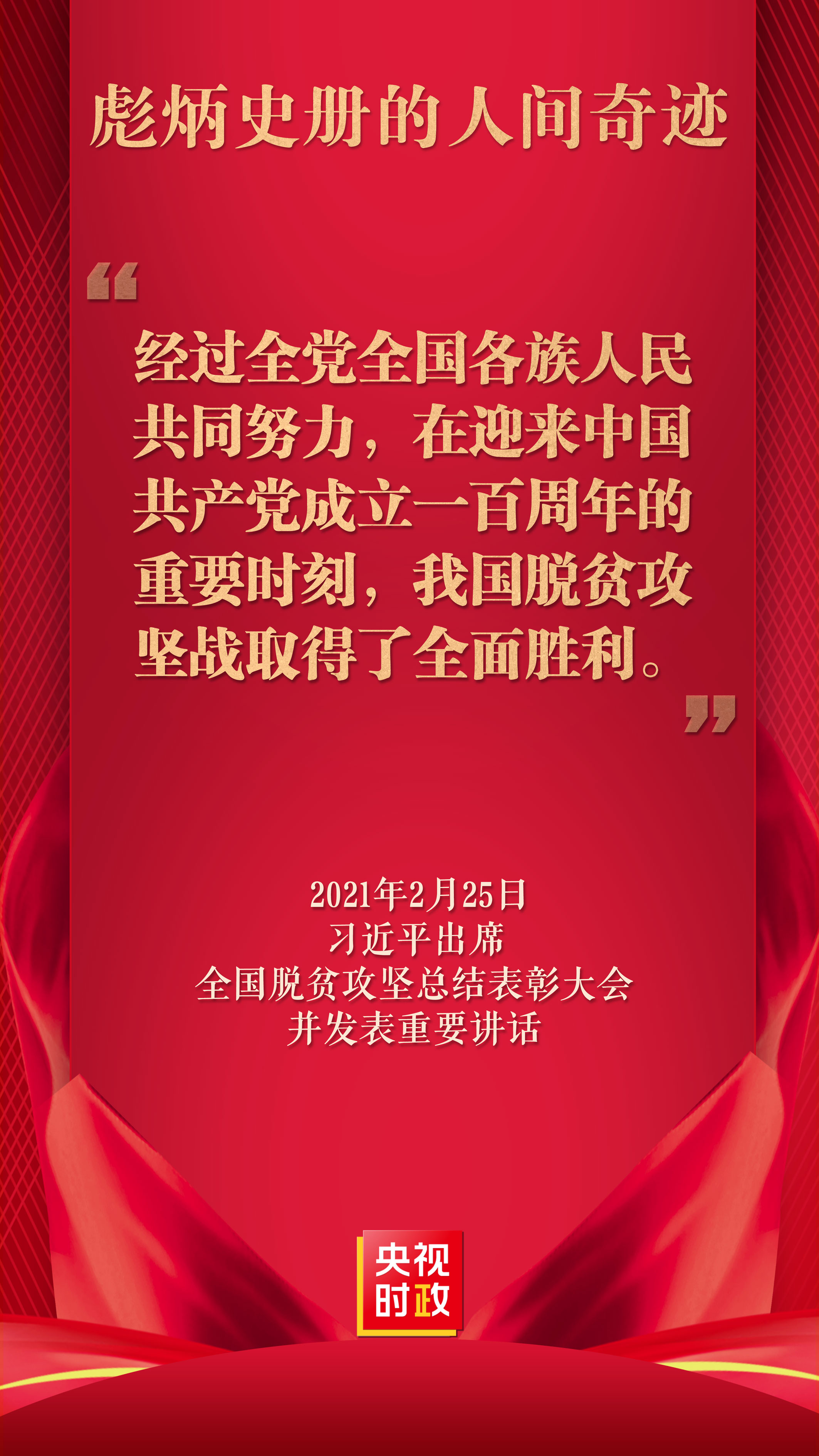 習近平莊嚴宣告,經過全黨全國各族人民共同努力,在迎來中國共產黨成立一百周年的重要時刻,我國脫貧攻堅戰取得了全面勝利,現行標準下9899萬農村貧困人口全部脫貧,832個貧困縣全部摘帽,12.8萬個貧困村全部出列,區域性整體貧困得到解決,完成了消除絕對貧困的艱巨任務,創造了又一個彪炳史冊的人間奇跡!這是中國人民的偉大光榮,是中國共產黨的偉大光榮,是中華民族的偉大光榮!