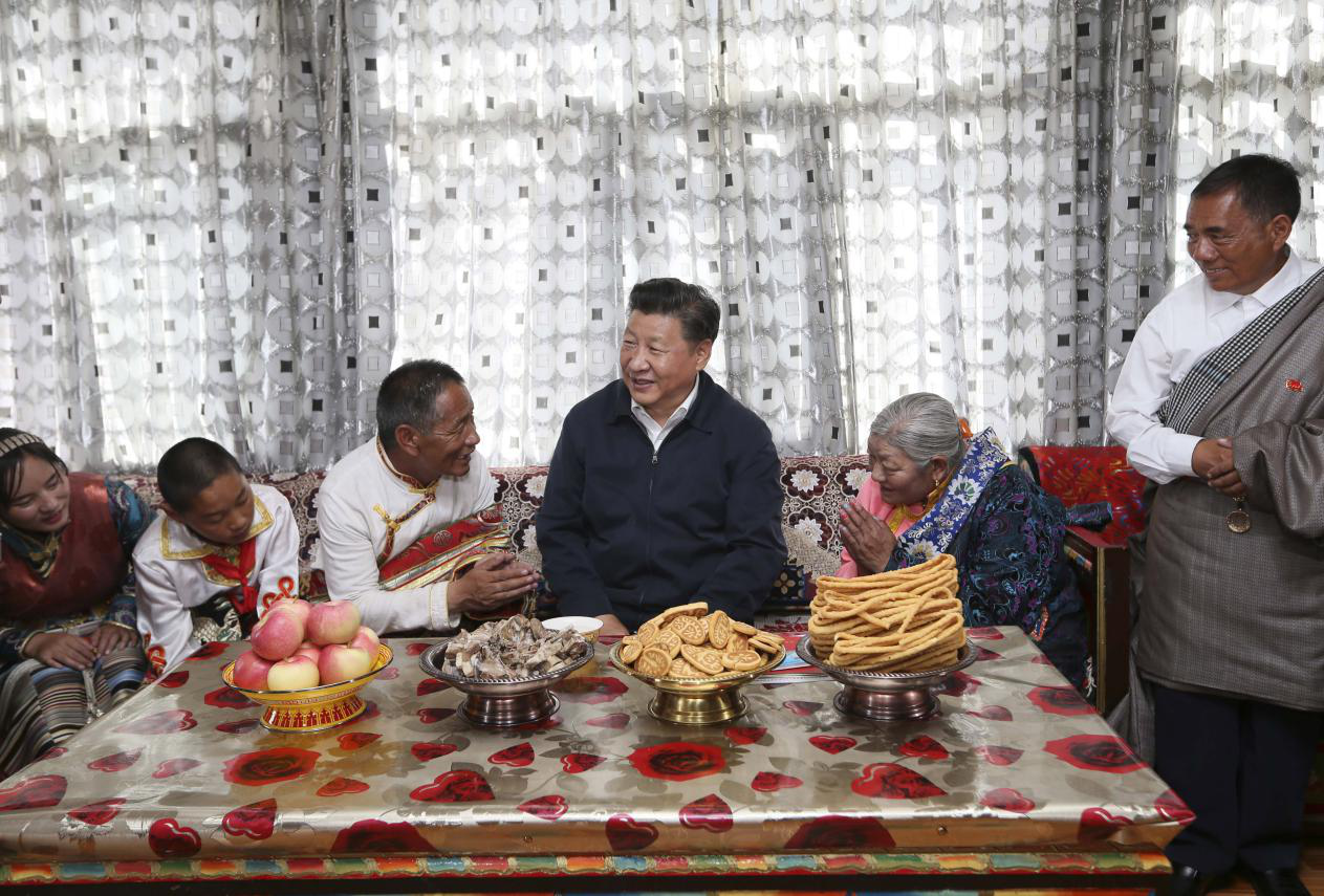 2016年8月22日,習(xí)近平總書記在青海省海西蒙古族藏族自治州格爾木市唐古拉山鎮(zhèn)長(zhǎng)江源村藏族村民申格家中同一家人親切交談。