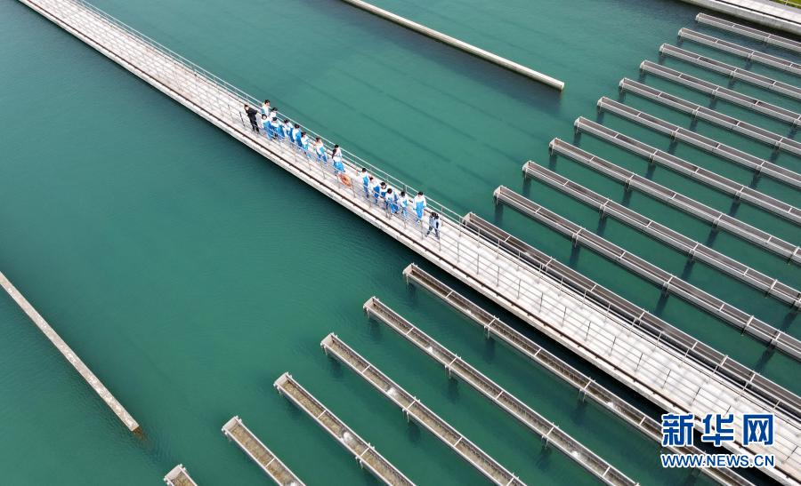 3月21日,水廠工作人員向學生介紹自來水生產流程(無人機照片)。