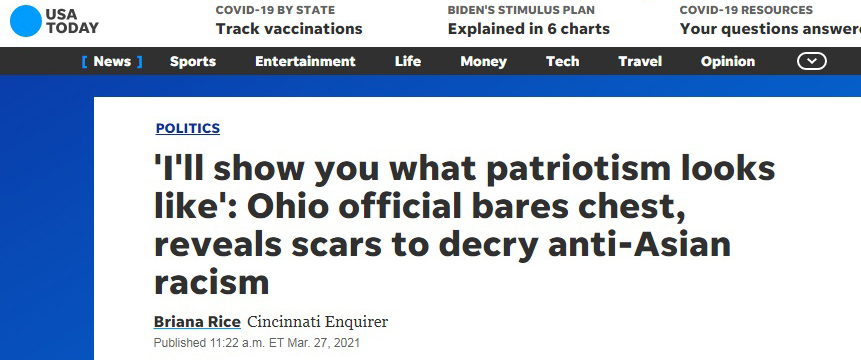 △《今日美國(guó)報(bào)》網(wǎng)站報(bào)道,俄亥俄州的官員展示胸部傷痕譴責(zé)美國(guó)歧視亞裔。