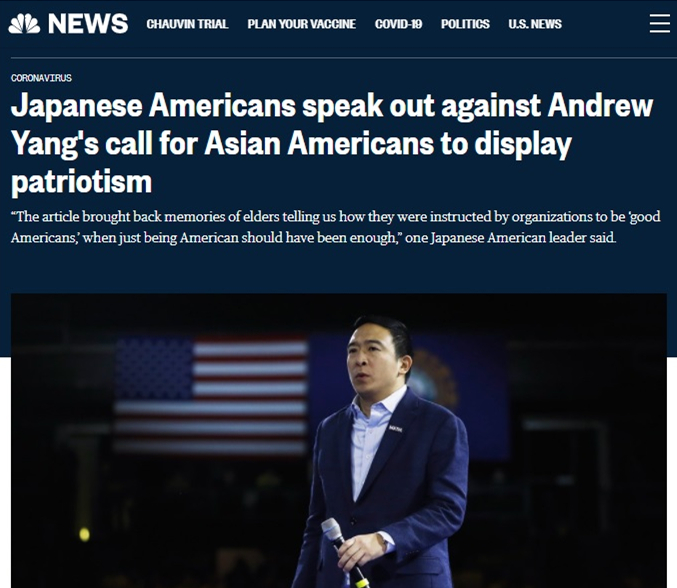 △美國(guó)全國(guó)廣播公司網(wǎng)站2020年報(bào)道,日裔美國(guó)人反對(duì)楊安澤呼吁的“亞裔應(yīng)展現(xiàn)出愛(ài)國(guó)主義”。