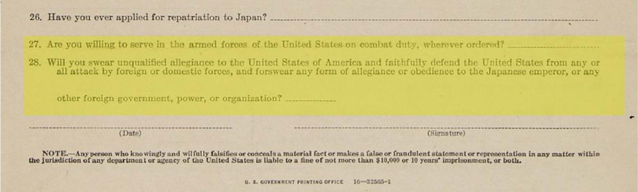 第28問(wèn):你是否誓言無(wú)條件效忠美國(guó)、忠實(shí)捍衛(wèi)美國(guó)免于任何來(lái)自國(guó)內(nèi)外的攻擊,并且放棄對(duì)日本天皇或其他外國(guó)政府與組織任何形式的效忠?