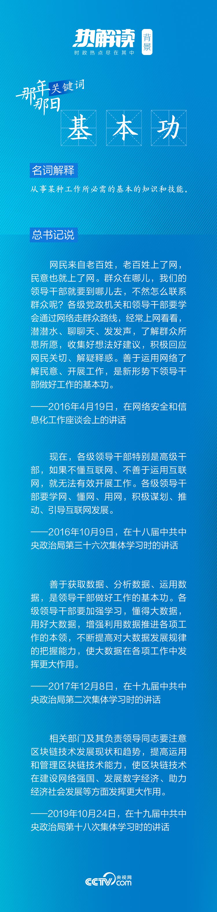 《熱解讀》關(guān)注到,這次重要講話中所提的“基本功”,之后總書記又多次提及,并反復(fù)強調(diào)互聯(lián)網(wǎng)時代領(lǐng)導(dǎo)干部“運用網(wǎng)絡(luò)”的重要意義。