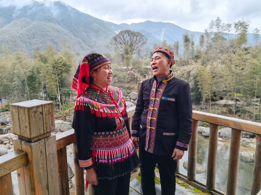 鄧?guó)P志(右)與愛(ài)人對(duì)唱瑤族傳統(tǒng)山歌。(新華社記者盧羨婷2021年2月9日攝)
