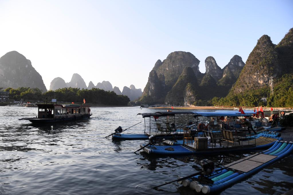 陽(yáng)朔縣興坪鎮(zhèn)漓江上的渡船和觀光竹筏。(新華社記者曹祎銘2019年11月19日攝)