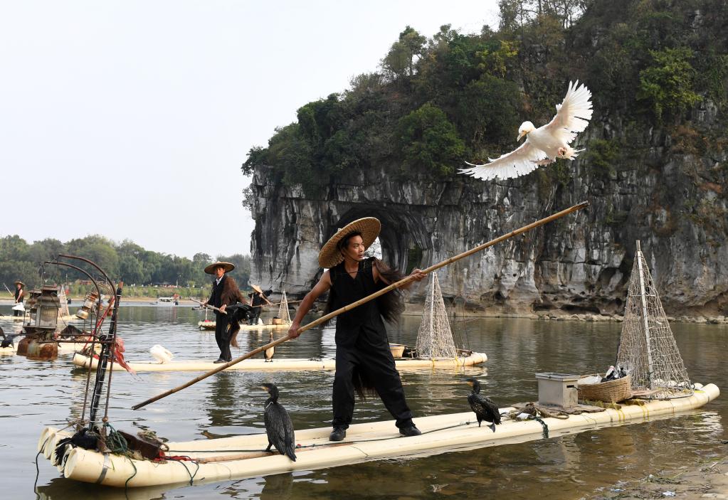 在桂林市象山景區(qū),“漁夫”為游客表演魚(yú)鷹捕魚(yú)。(新華社記者陸波岸2017年10月24日攝)