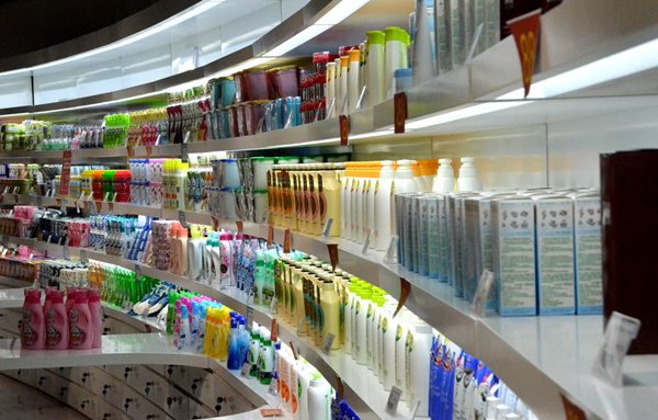西海岸新區中日韓消費專區體驗中心里琳瑯滿目的免稅產品。人民網記者 孫博洋攝