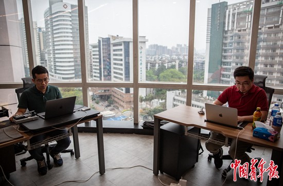 4月20日,廣州市天河區港澳青年之家,誠明倉儲有限公司創始人王賦源、古偉龍在辦公室內。《粵港澳大灣區規劃綱要》讓這兩位來自香港的80后看到了在整個大灣區大展拳腳的可能性。目前他們的智能儲物倉已在廣深落地,古偉龍說,未來計劃從灣區走向全國,“全中國,必須的”。