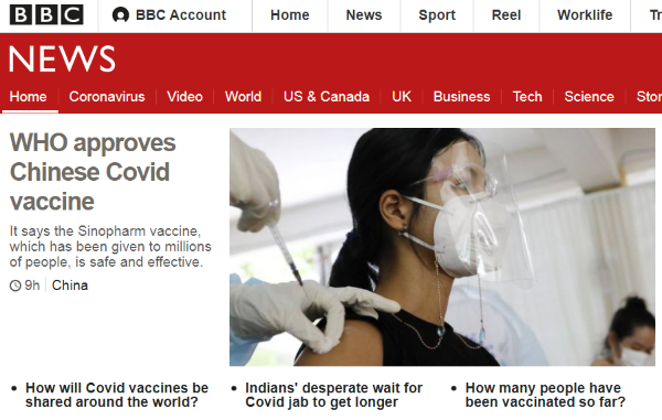 英國廣播公司(BBC)報道稱,世界衛(wèi)生組織周五表示,它已驗證了國藥疫苗的“安全性、有效性和質(zhì)量”。這是第一款得到世衛(wèi)組織支持的非西方國家研制的新冠疫苗。中國和其他一些國家已經(jīng)有數(shù)千萬人接種了國藥疫苗。