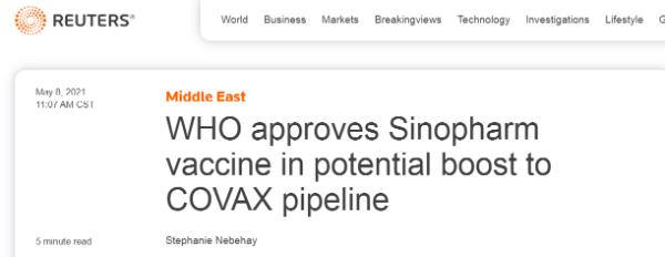 英國路透社報道認為,世界衛(wèi)生組織周五批準中國國有制藥企業(yè)國藥集團生產(chǎn)的新型冠狀病毒疫苗可用于緊急使用,這將推動中國在全球新冠疫苗接種方面發(fā)揮重要作用。