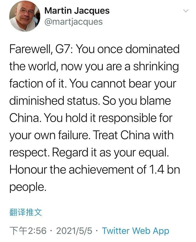 馬丁·雅克表示,“再見了,七國集團!曾經統治世界,但現在影響力江河日下。不滿現在的衰頹,你們就去指責中國,你們應該為自身的失敗負責!對待中國要放尊重些,彼此之間要平等相待。對待十四億中國人取得的成就更要放尊重些!”