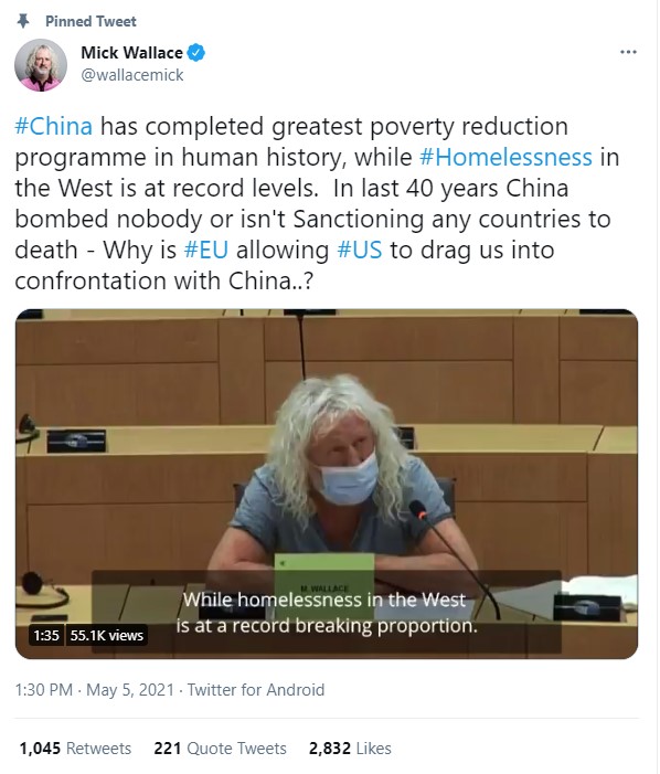 歐洲議會議員米克·華萊士(Mick Wallace)5月5日在議會發言時深入分析了中國“從來不侵略、從來不轟炸、從來不制裁別國”的和平發展歷程,痛斥了西方的劣勢發展基礎。