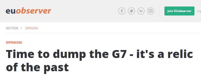 在G7外長會召開前夕,歐洲媒體《歐盟觀察者》(EU Observer)在其網站刊發評論文章《是時候拋棄G7了,它是歷史遺物》。