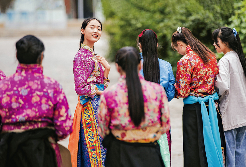 2020年8月6日,青海門源回族自治縣珠固鄉東旭村,村民們身著盛裝準備去表演鍋莊舞。 中國文聯供圖 費茂華/攝