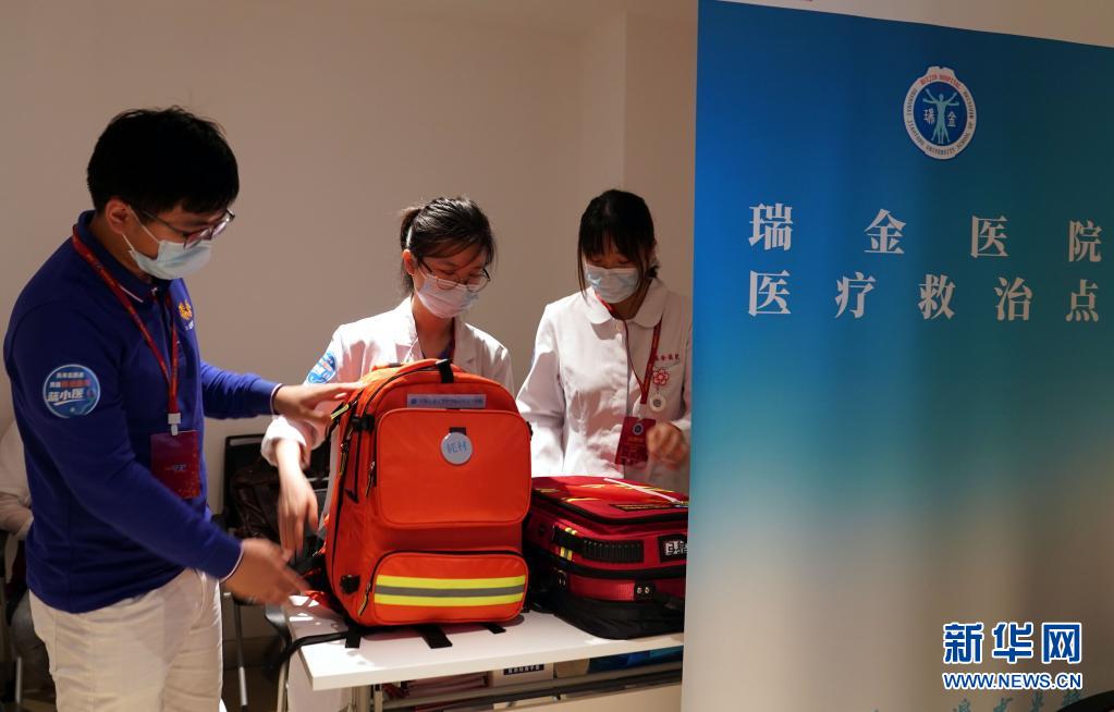 上海交通大學醫學院附屬瑞金醫院的醫護人員擔當志愿者,在中共一大紀念館設立醫療救治點,提供醫療保障任務(7月11日攝)。