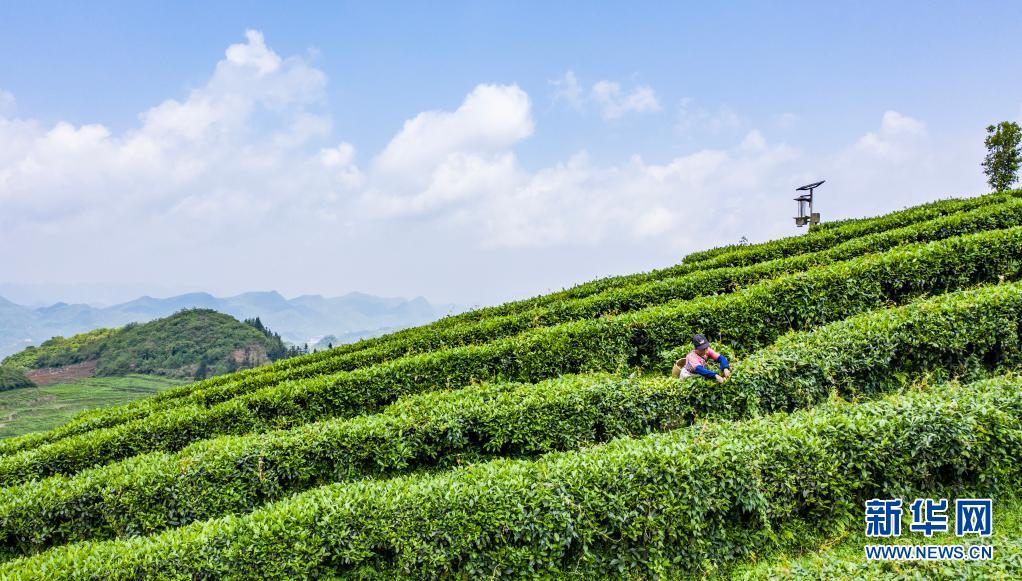 在貴州省六盤水市六枝特區落別鄉,茶農在采茶(4月20日攝,無人機照片)。新華社記者 陶亮 攝