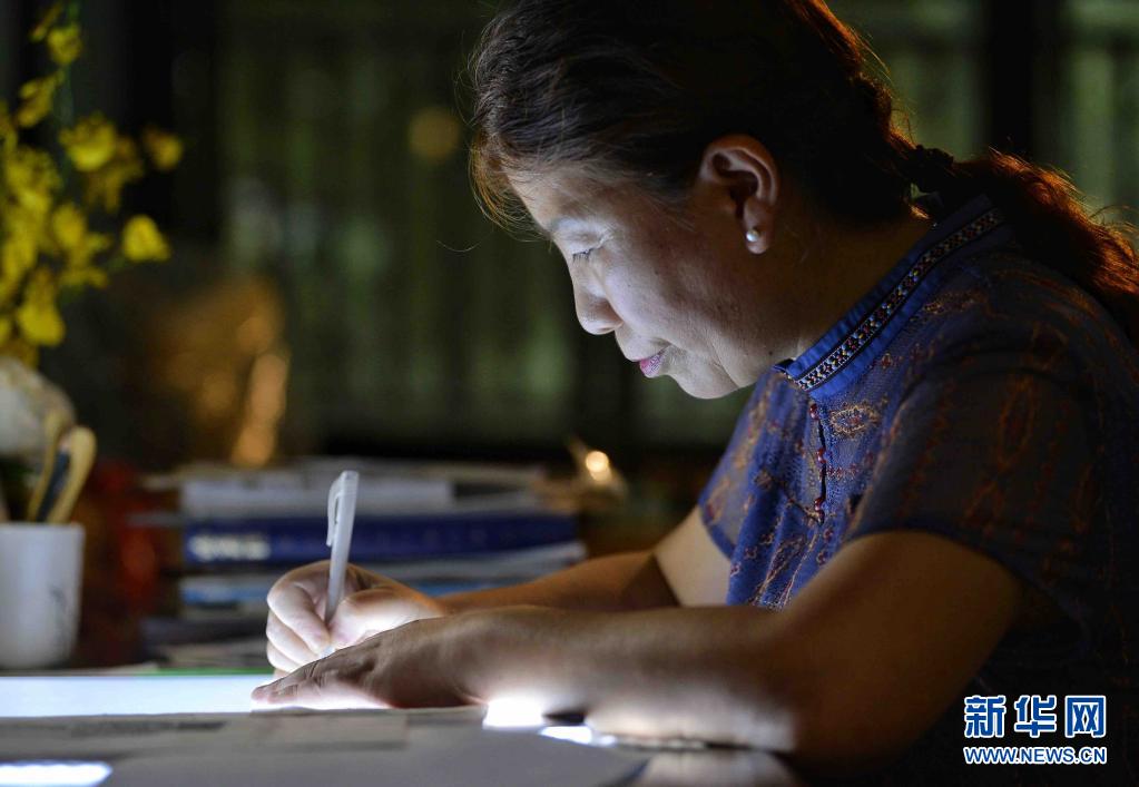 道安在設(shè)計銀花絲擺件的圖稿(7月15日攝)。