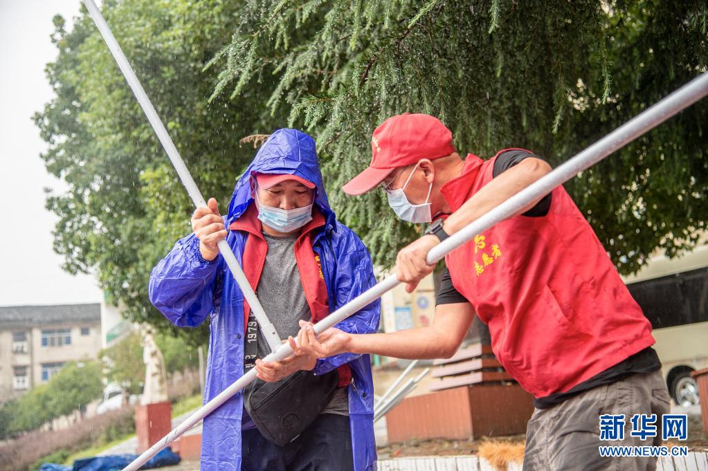 8月13日,救援人員在緊急搭建臨時安置點。