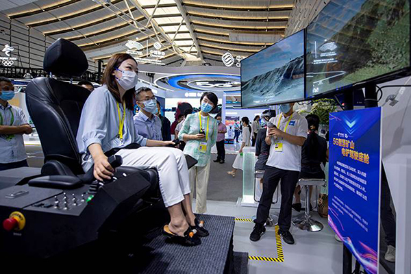 9月26日,在“互聯(lián)網(wǎng)之光”博覽會上,參觀者正在體驗無人駕駛的礦產(chǎn)挖掘設(shè)備。人民網(wǎng)記者 翁奇羽攝