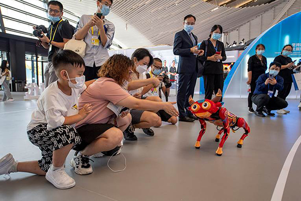 9月26日,在“互聯(lián)網(wǎng)之光”博覽會上,憨態(tài)可掬的機(jī)器牛吸引著許多參觀者的目光。人民網(wǎng)記者 翁奇羽攝